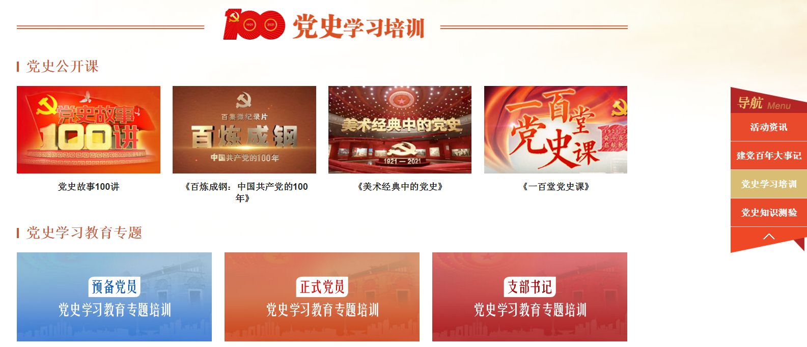 “党史学习培训”栏目包括党史公开课和党史学习教育专题培训两个模块。党史公开课模块将中组部党员教育中心、中央党史和文献研究院等的精品课、优质课、特色课按照专题在网站公开推出,为我校广大党员和师生员工提供更优质、更丰富、更系统的理论学习资源。党支部书记培训、党员培训、预备党员培训等专题培训后期会根据学校党委安排陆续上线。