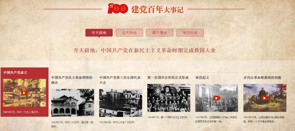 “建党百年大事记”栏目分为开天辟地、改天换地、翻天覆地、惊天动地四个模块,系统地介绍了从建党的开天辟地,到新中国成立的改天换地,到改革开放的翻天覆地,再到党的十八大以来党和国家事业取得历史性成就、发生历史性变革的百年历程。