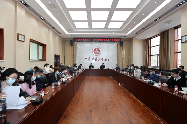 机关党委全体党员分别通过现场和腾讯会议的方式参加讲座,副校长崔希民出席讲座并讲话,党委常委、统战部部长、机关党委书记邹得志主持讲座。