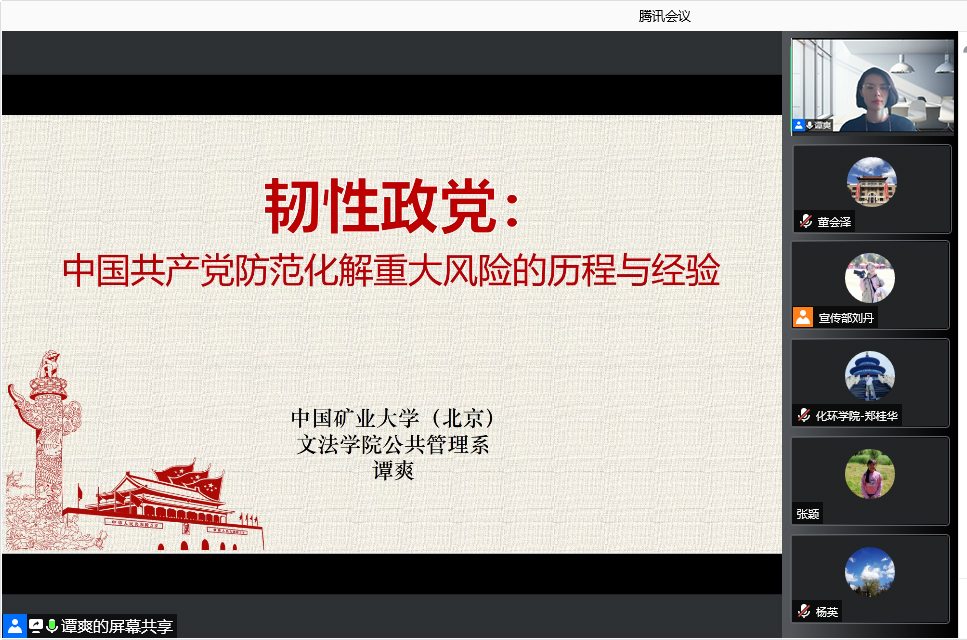 本网讯 为深入学习贯彻党的十九届六中全会精神,扎实推进党史学习教育工作,12月16日下午,学校通过线上视频方式举行党史学习教育第十五场专题辅导报告会。我校文法学院副院长、博士生导师谭爽教授以《韧性政党:中国共产党防范化解重大风险的历程与经验》为题作辅导报告。校党委常委、宣传部部长董会泽主持会议,全校副处级以上干部、教师、学生党支部书记代表近两百人参加会议。