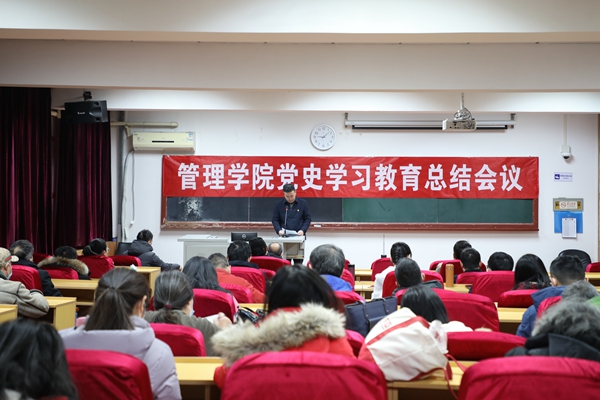 本网讯 1月12日上午,管理学院在理化楼306召开党史学习教育总结会议。学院全体教职工、学生党员和学生代表共61人参加会议。管理学院党委书记杨庆舟作总结报告,党委副书记李邦三主持会议。