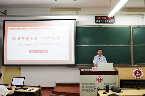 本网讯 6月9日下午,校党委副书记王忠强在学院路校区教学楼112讲授题为《从百年党史看“四个自信”》的专题党课。文法学院党委书记杨洪兵主持,文法学院师生党员和发展对象100余人聆听党课。
